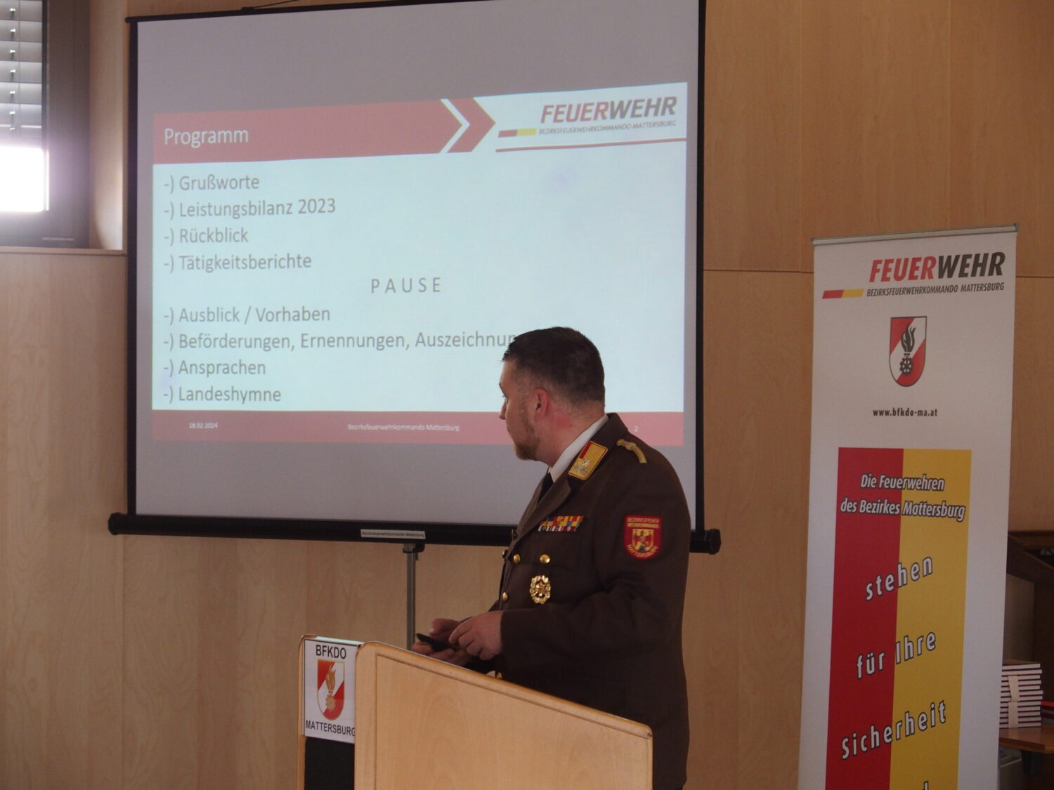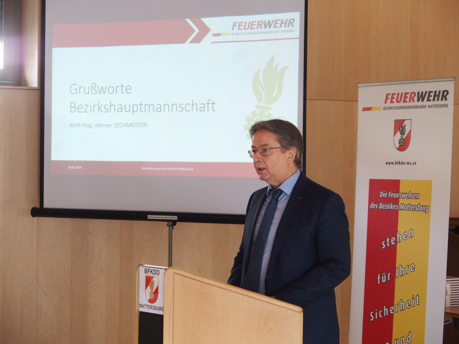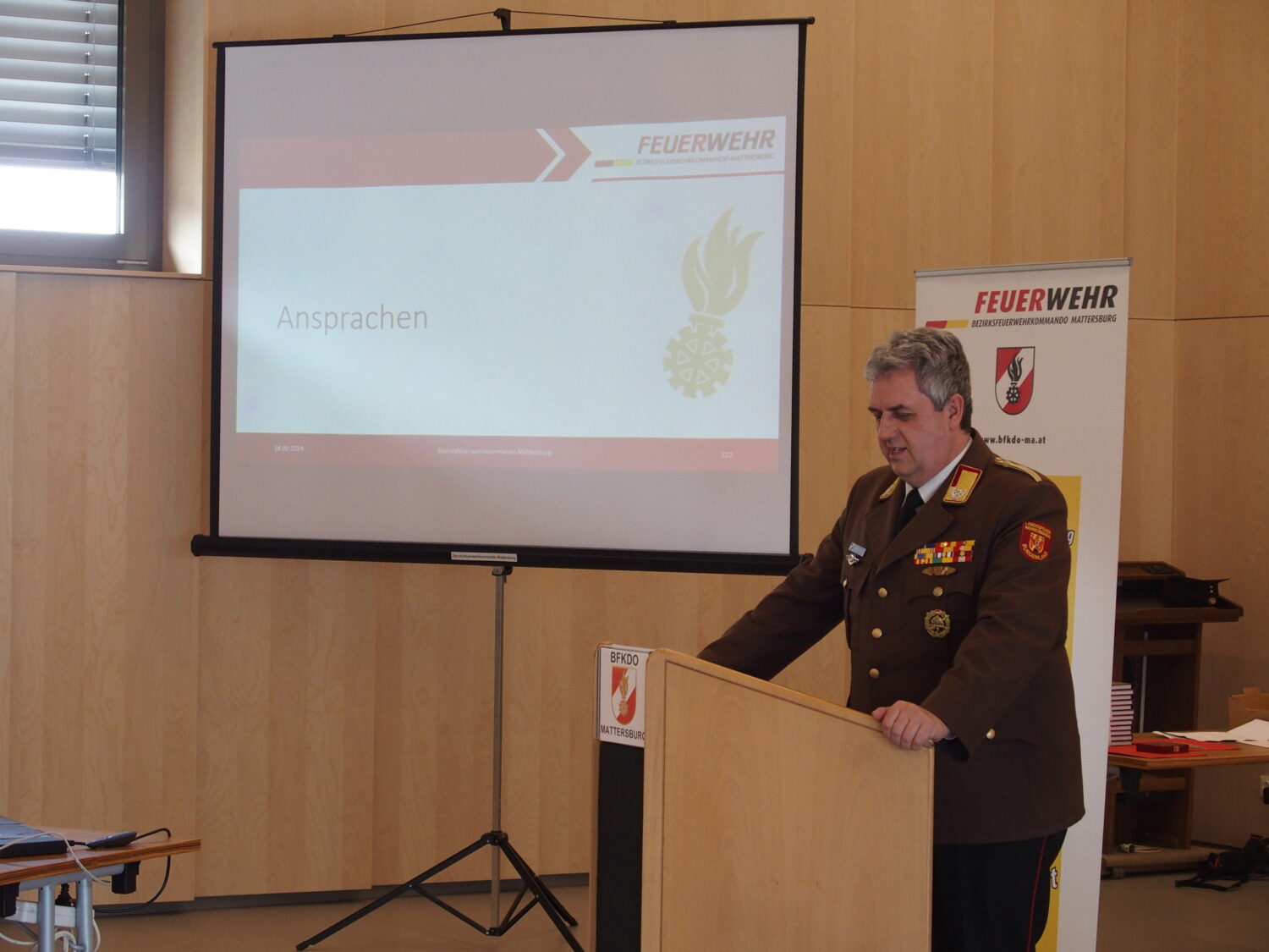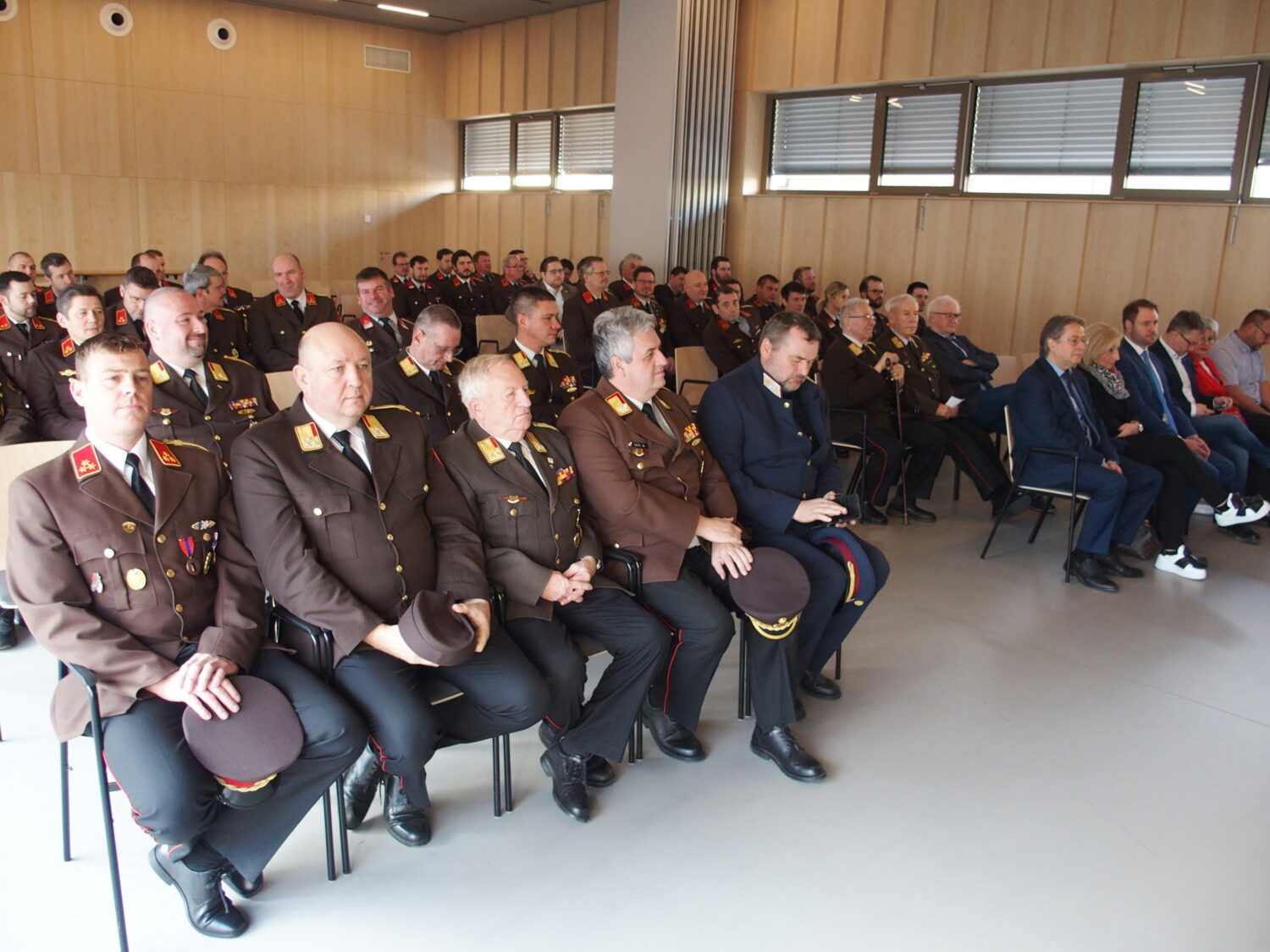 Nach den einleitenden Grußworten des Bezirkshauptmanns WHR Mag. Werner Zechmeister, erfolgte die Leistungsbilanz des vergangenen Jahres. Besonders hervorzuheben sind hierbei, neben der Einsatzstatistik, die zum Vorjahr gestiegenen absolvierten Lehrgänge an der Feuerwehrschule sowie die der Leistungsabzeichen. In Zahlen ausgedrückt, wurden im Jahr 2023 70 verschiedene Lehrgänge von 893 Teilnehmern besucht und rund 245 Leistungsabzeichen erfolgreich absolviert.