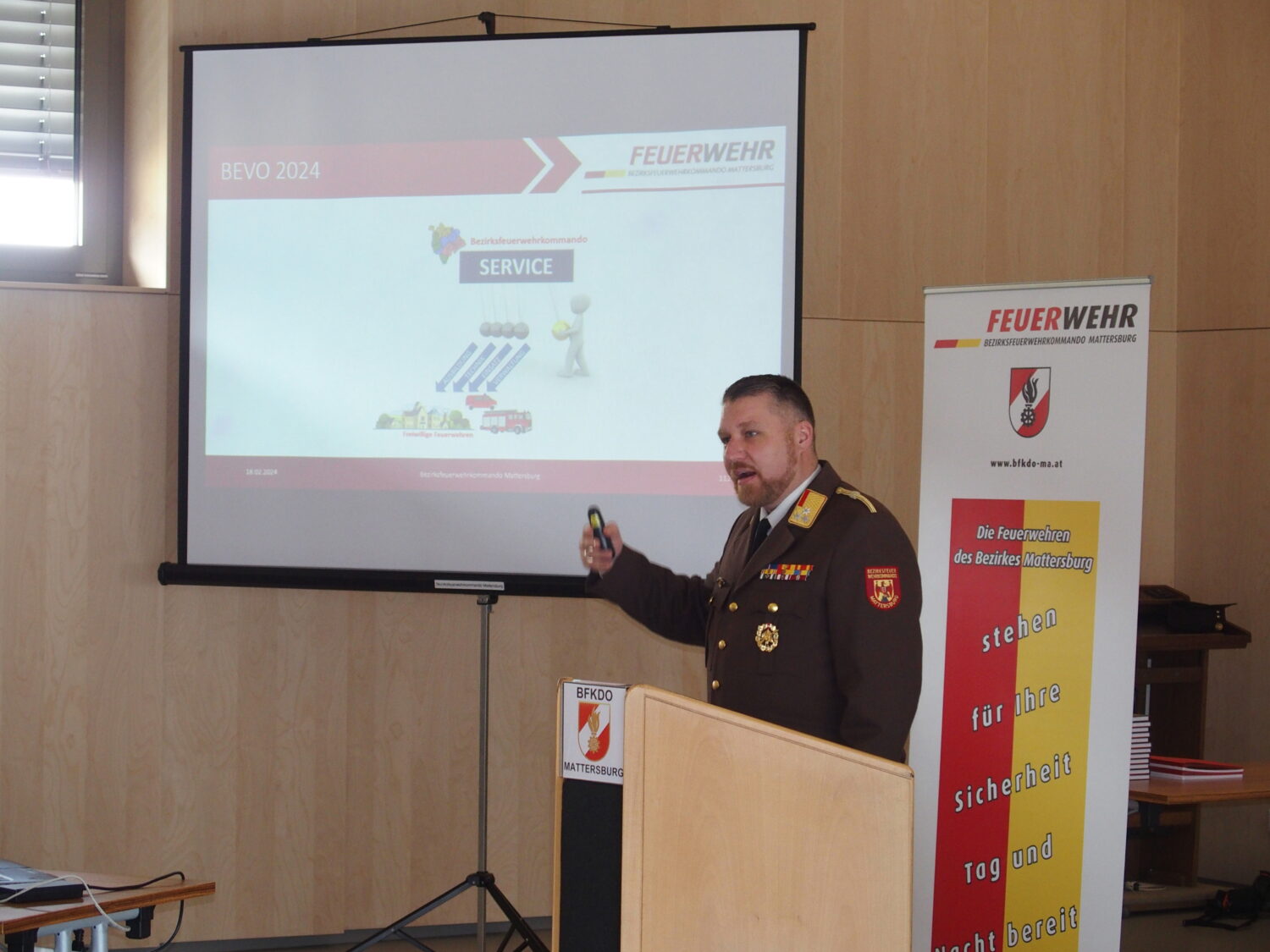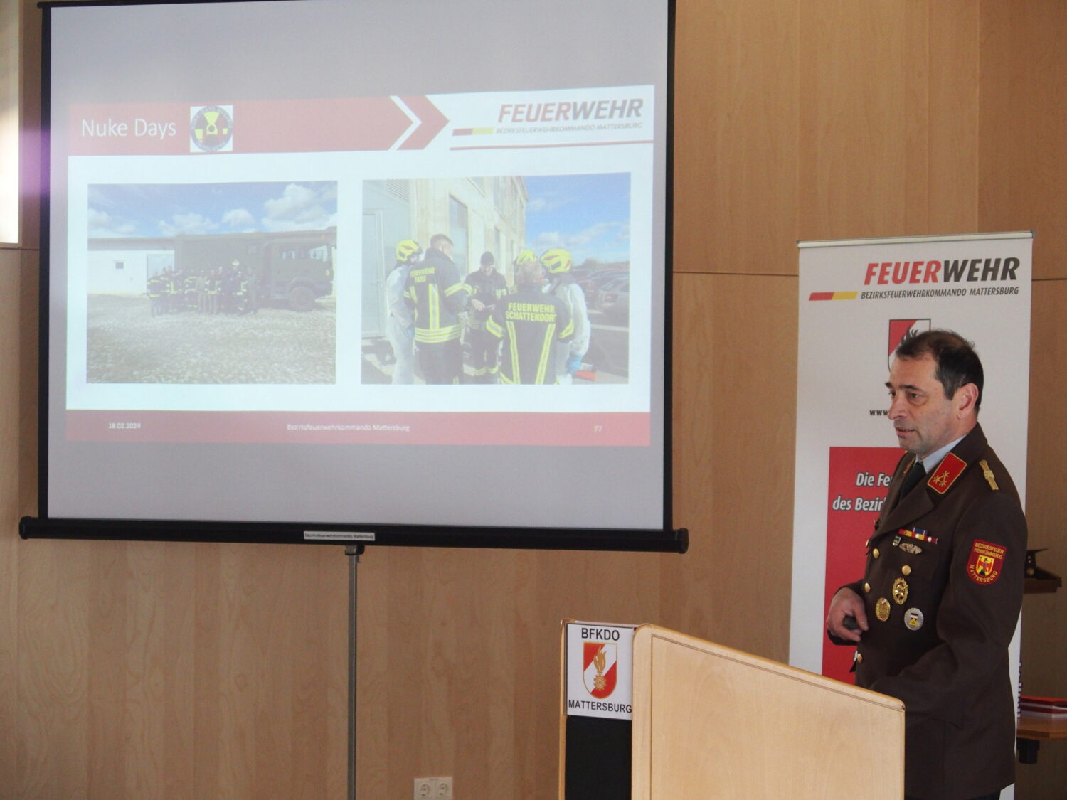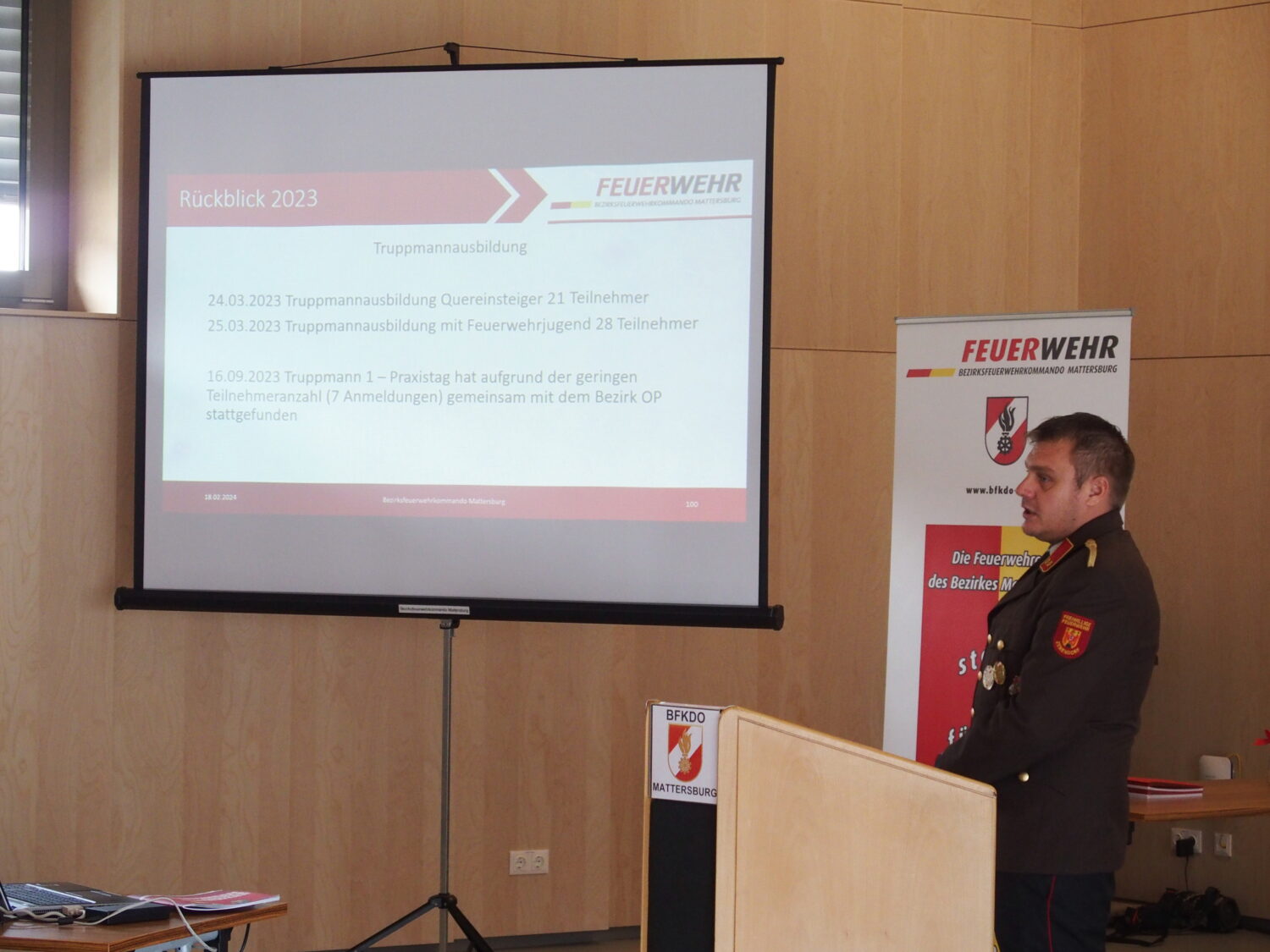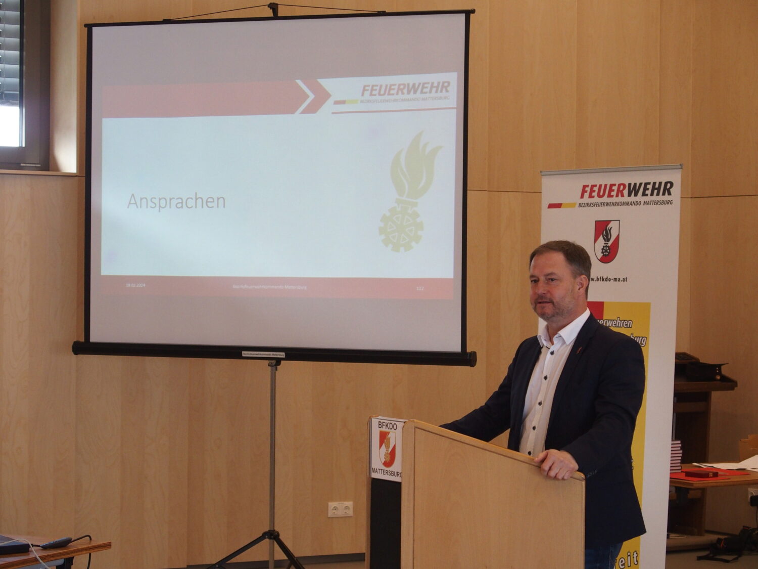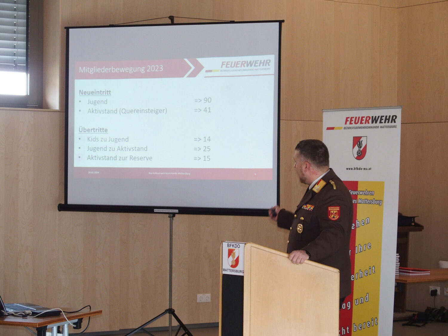 Nach den einleitenden Grußworten des Bezirkshauptmanns WHR Mag. Werner Zechmeister, erfolgte die Leistungsbilanz des vergangenen Jahres. Besonders hervorzuheben sind hierbei, neben der Einsatzstatistik, die zum Vorjahr gestiegenen absolvierten Lehrgänge an der Feuerwehrschule sowie die der Leistungsabzeichen. In Zahlen ausgedrückt, wurden im Jahr 2023 70 verschiedene Lehrgänge von 893 Teilnehmern besucht und rund 245 Leistungsabzeichen erfolgreich absolviert.