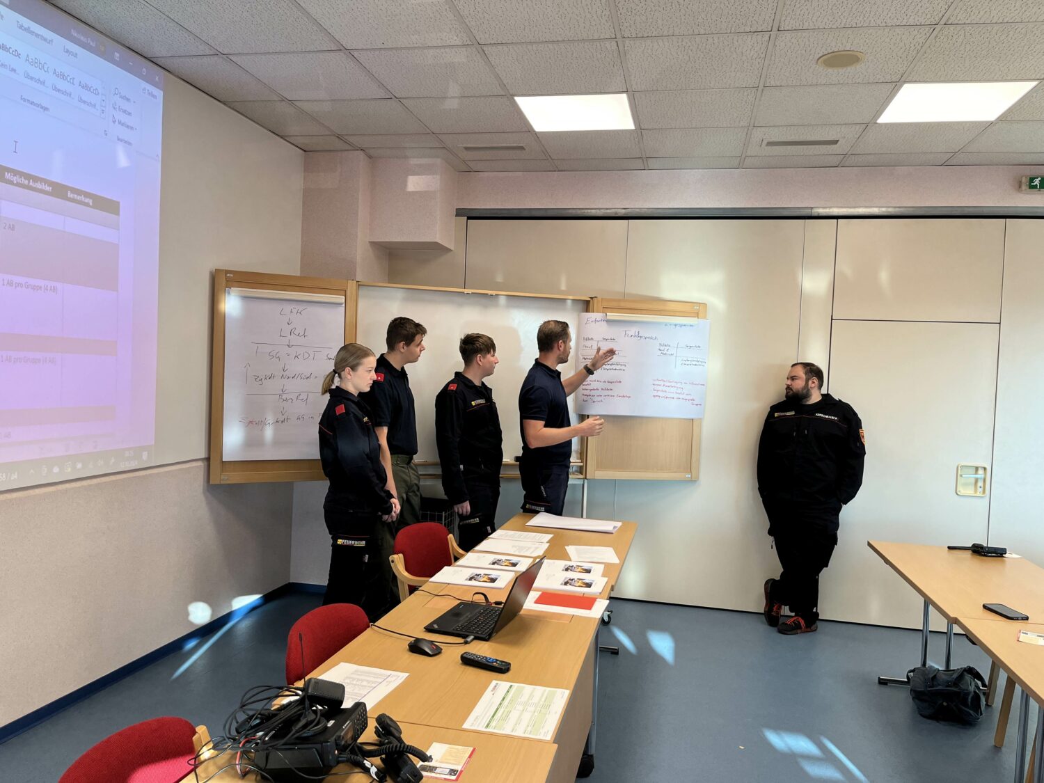 Aufgrund der neuen Ausrichtung des Lehrganges standen an diesem Tag die praktischen Funkübungen im Fokus. Zu Beginn wurde im Zuge von Gruppenarbeiten das theoretische Grundwissen, welches im E-Learning Teil vermittelt wurde, aufgefrischt bzw. wiederholt. In den anschließenden Funkübungen wurde das zuvor Besprochene praktisch beübt und im Weiteren gefestigt.