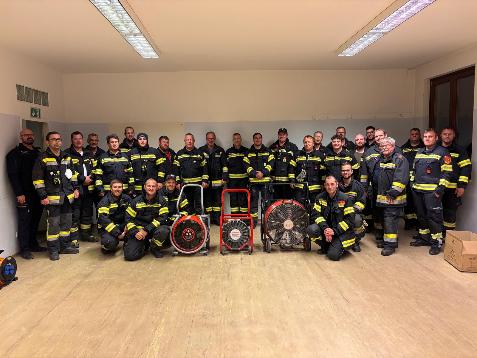 Unter der Leitung von HBI Martin Vogler nahmen rund 30 Feuerwehrmitglieder an dieser Weiterbildung teil. Im theoretischen Teil wurden die Grundlagen und Einsatzmöglichkeiten der Rauchentlüftung vermittelt, bevor die Inhalte anschließend in praktischen Übungen beübt und vertieft wurden.