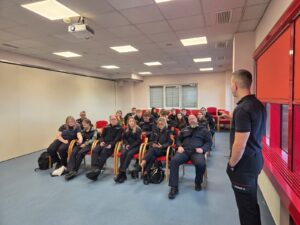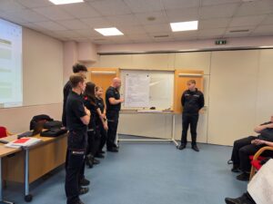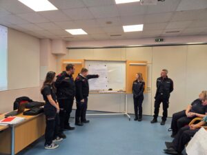 Nach dem im Vorfeld absolvierten E-Learning-Teil lag der Schwerpunkt dieses Tages ganz auf der praktischen Ausbildung. Zu Beginn wurden die theoretischen Grundlagen in Gruppenarbeiten wiederholt, bevor in mehreren Stationen Funkübungen durchgeführt wurden.