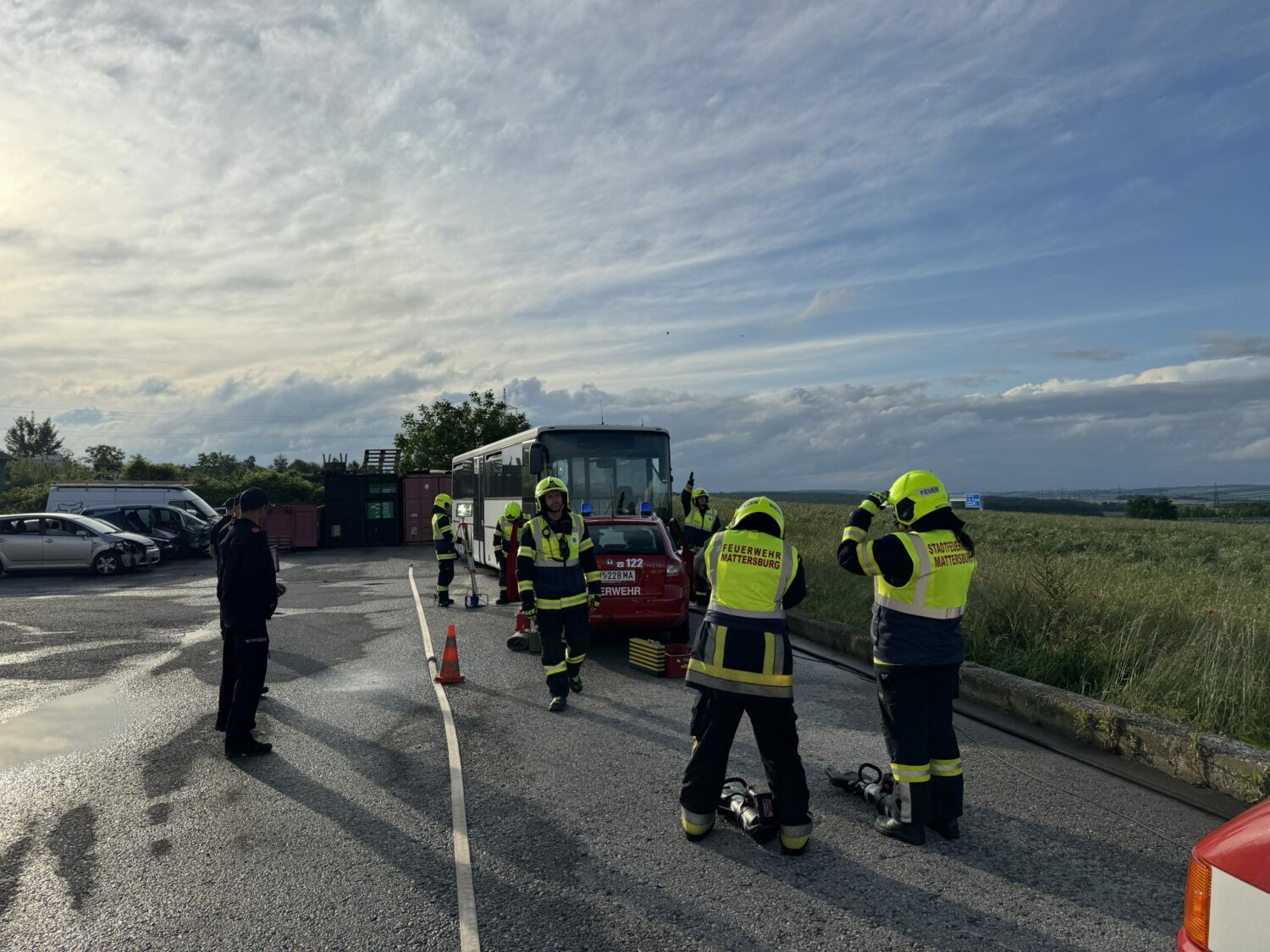 Anschließend folgte der praktische Teil, bei dem ein Verkehrsunfall mit verletzter bzw. eingeklemmter Person simuliert wurde. Der Sicherungstrupp übernahm die Absicherung der Unfallstelle in beiden Richtungen, um die Einsatzkräfte während der Rettungsmaßnahmen zu schützen. Parallel dazu wurde ein zweifacher Brandschutz mit einem Pulverlöscher und einer Schnellangriffsleitung aufgebaut. Währenddessen kümmerte sich der Rettungstrupp um die Versorgung und Betreuung der verletzten Person im Fahrzeug.