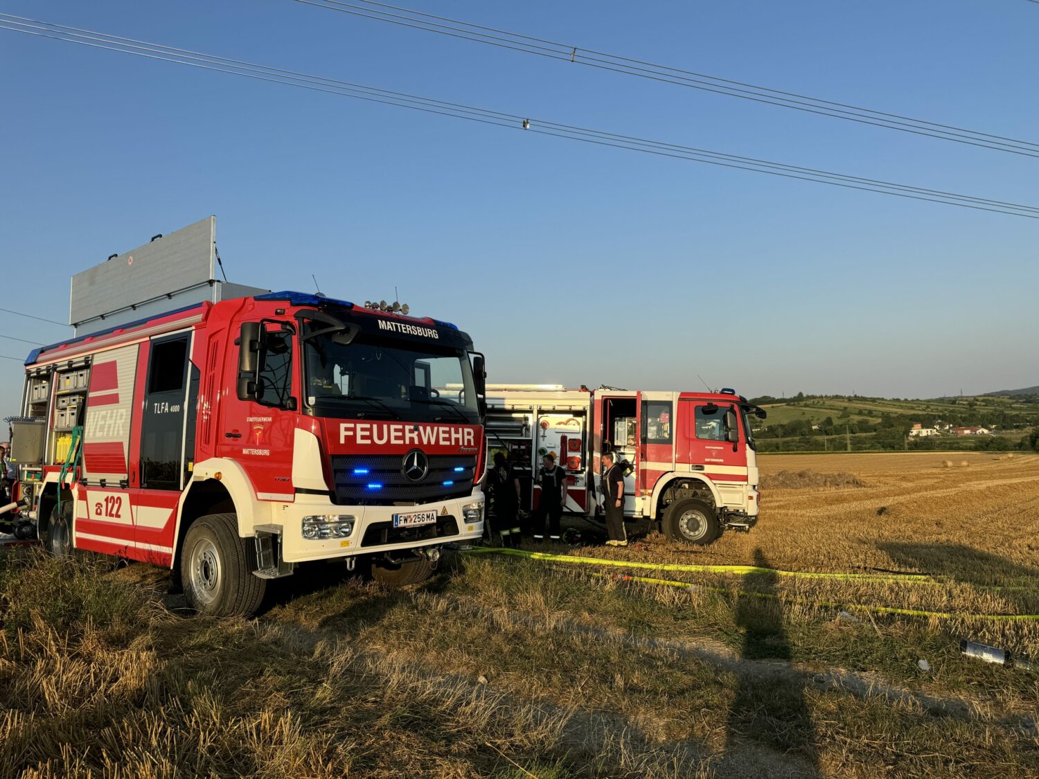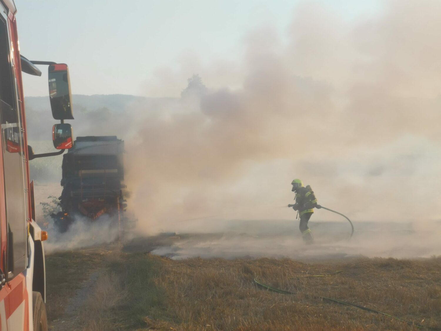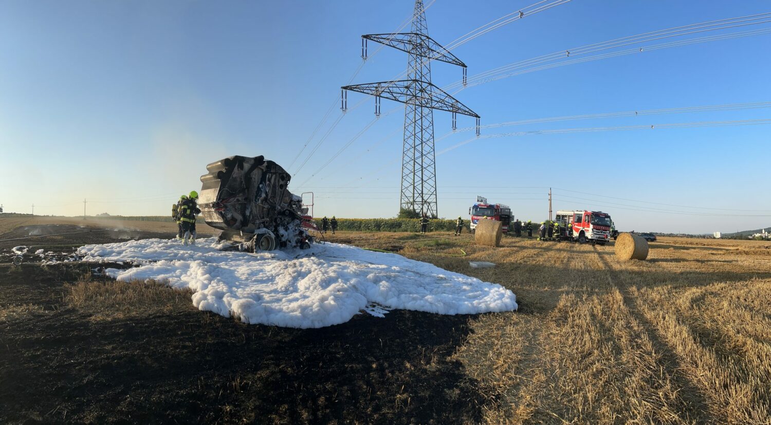 Gegen 19:00 Uhr wurden die Feuerwehren Mattersburg und Walbersdorf mittels Sirene und Rufempfänger zu einem Strohpressenbrand in der Nähe der S31 gerufen. Bereits auf der Anfahrt waren dichte Rauchschwaden sichtbar. Beim Eintreffen stand die landwirtschaftliche Maschine in Vollbrand. Dieser breitete sich rasch auf die umliegende Ackerfläche aus. Durch die schnelle Reaktion des Lenkers, welcher die Ballenpresse abkoppelte, konnte ein Übergreifen auf die Zugmaschine verhindert werden. Nach dem Eintreffen der beiden Löschfahrzeuge wurde umgehend ein Löschangriff mit zwei C-, einer Hochdruck- sowie einer Schaumschnellangriffs-Leitung, teils unter schwerem Atemschutz durchgeführt. Parallel dazu wurden einzelne Glutnester durch den Einsatz von Löschrucksäcken und Bodenbearbeitungswerkzeugen bekämpft. Nach dem effektiven Erstangriff wurden noch Nachlöscharbeiten durchgeführt und durch den betroffenen Bauern die Brandstellen mittels Grubber bearbeitet.