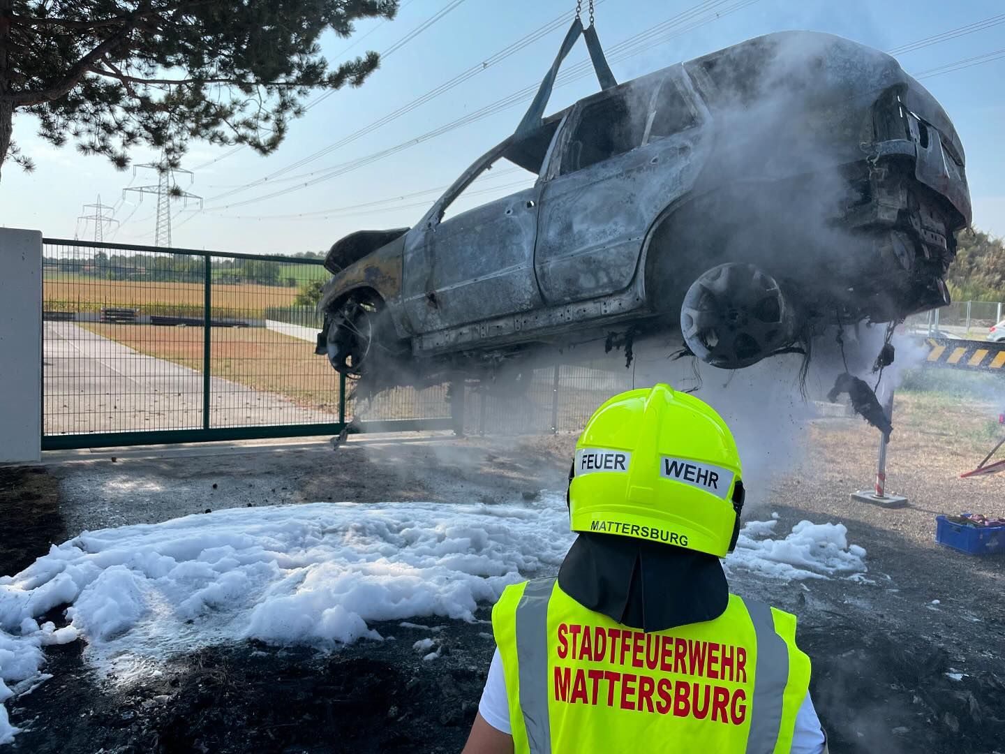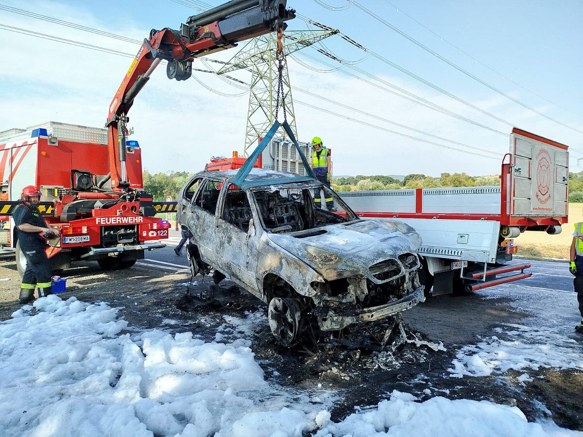 Das Auto wurde mit dem Kran des SRF auf das Abschleppplateau des WLF verladen und auf einem gesicherten Parkplatz abgestellt. Bei dem Brand wurde niemand verletzt.