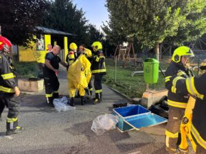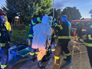 Nach dem Eintreffen an der Einsatzstelle sicherte die Feuerwehr Pöttsching das Gelände ab. Seitens der Feuerwehr Mattersburg rüstete sich ein Trupp mit Chemikalienschutzanzügen der Schutzstufe 3 aus, um im kontaminierten Bereich tätig zu werden. Zur Dekontamination wurden zwei weitere Kameraden mit Schutzstufe 2 Anzügen ausgestattet.