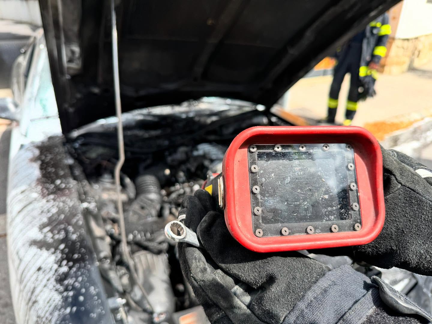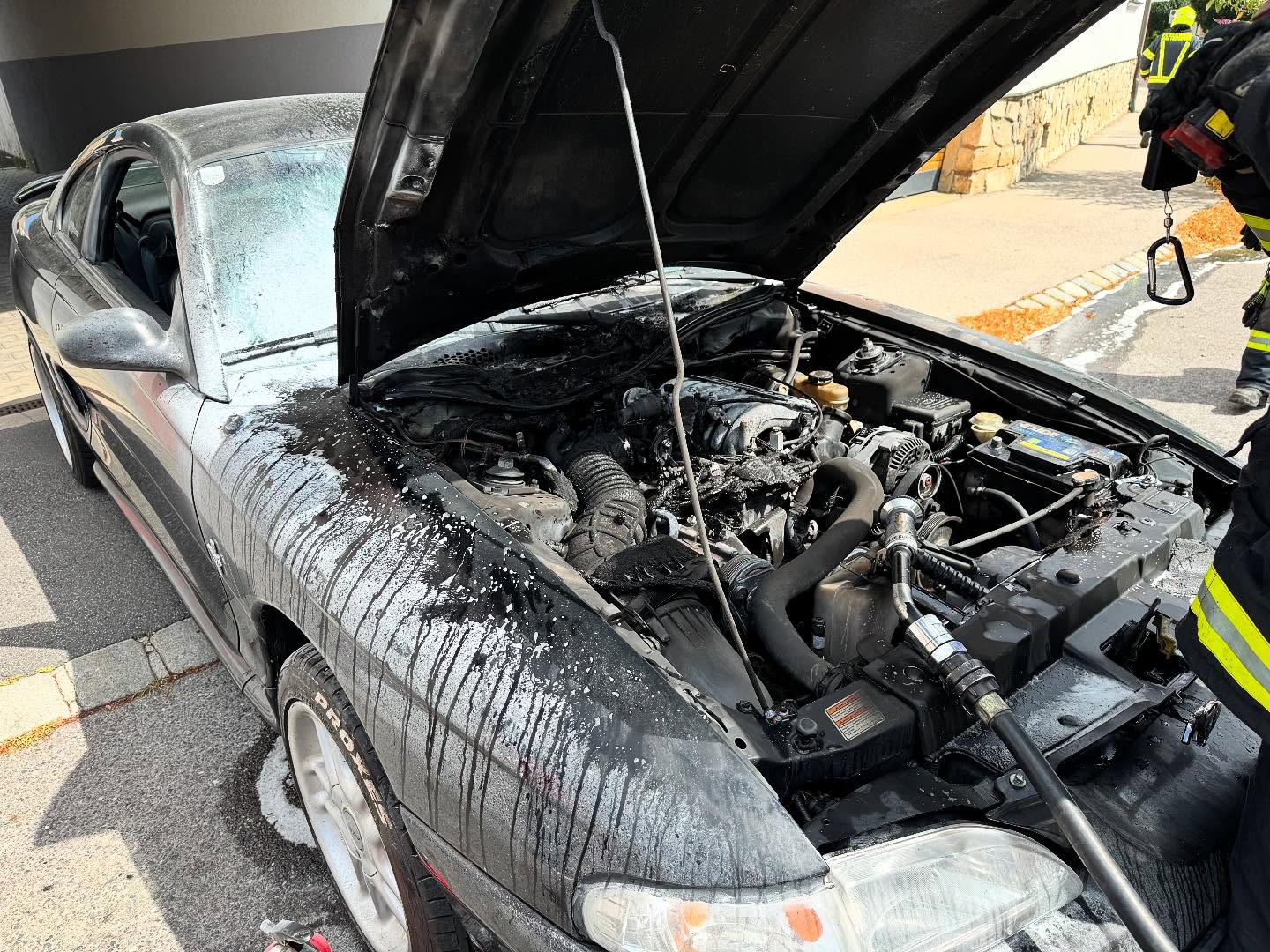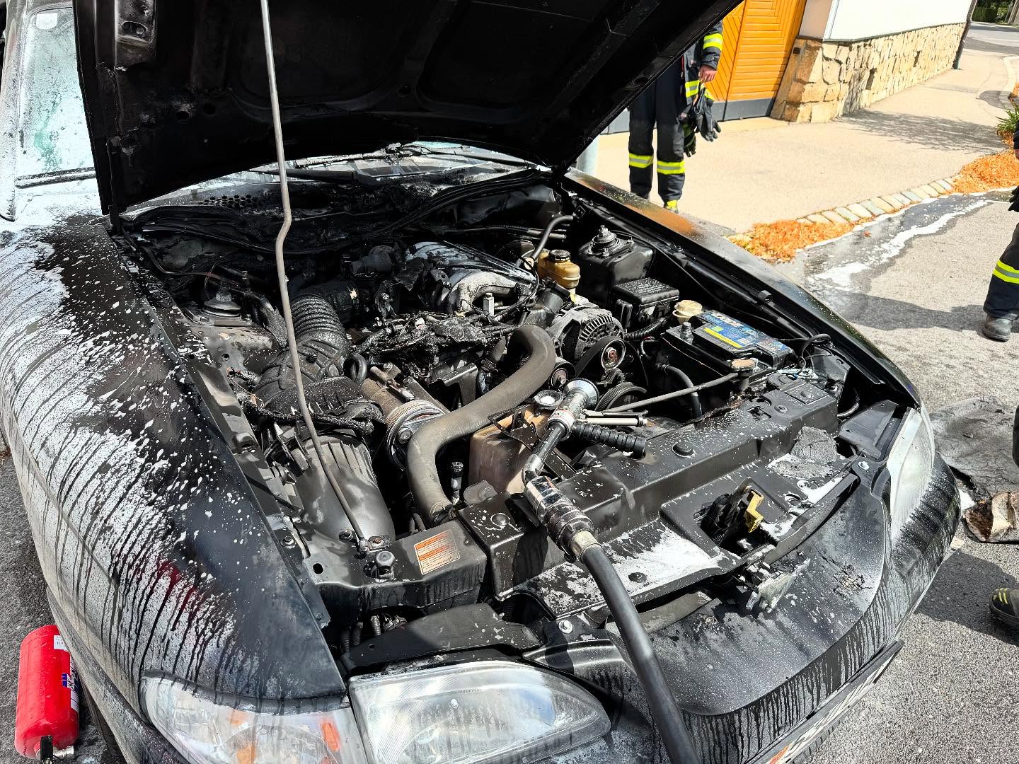 Beim Eintreffen stand ein PKW im Motorraumbereich in Brand. Glücklicherweise befand sich keine Person im Fahrzeug.