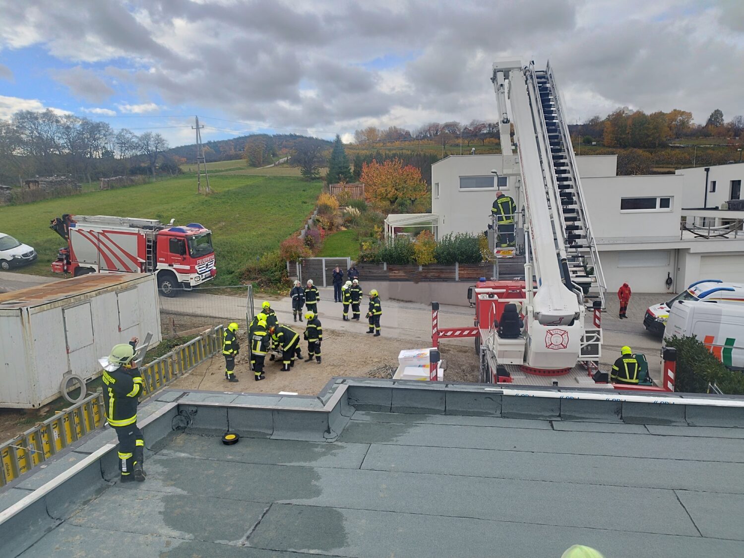 Am Vormittag, des 03.11.2025 wurde die Feuerwehr Mattersburg zur Unterstützung der Feuerwehr Wiesen bei einer Personenrettung nachalarmiert. Ein Arbeiter erlitt während Arbeiten auf einem Dach gesundheitliche Probleme und konnte das Dach nicht mehr selbstständig verlassen.