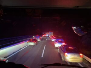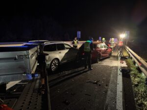 In den zweiten Unfall waren insgesamt fünf Fahrzeuge sowie ein Anhänger involviert. Mindestens eine Person wurde verletzt und durch den Rettungsdienst versorgt und in ein Krankenhaus gebracht. Seitens der Feuerwehr wurde die Unfallstelle gemeinsam mit der Autobahnpolizei abgesichert und die Unfallstelle ausgeleuchtet. Die Bergungsarbeiten wurden nach Abschluss der Unfallaufnahme durchgeführt. Zwei PKW sowie ein Anhänger mussten von der Feuerwehr abtransportiert werden. Drei weitere Fahrzeuge konnten die Fahrt in Begleitung von Autobahnpolizei und Feuerwehr bis zur nächsten Ausfahrt fortsetzen. Im Anschluss wurde die Fahrbahn gereinigt und ausgelaufene Betriebsmittel gebunden.