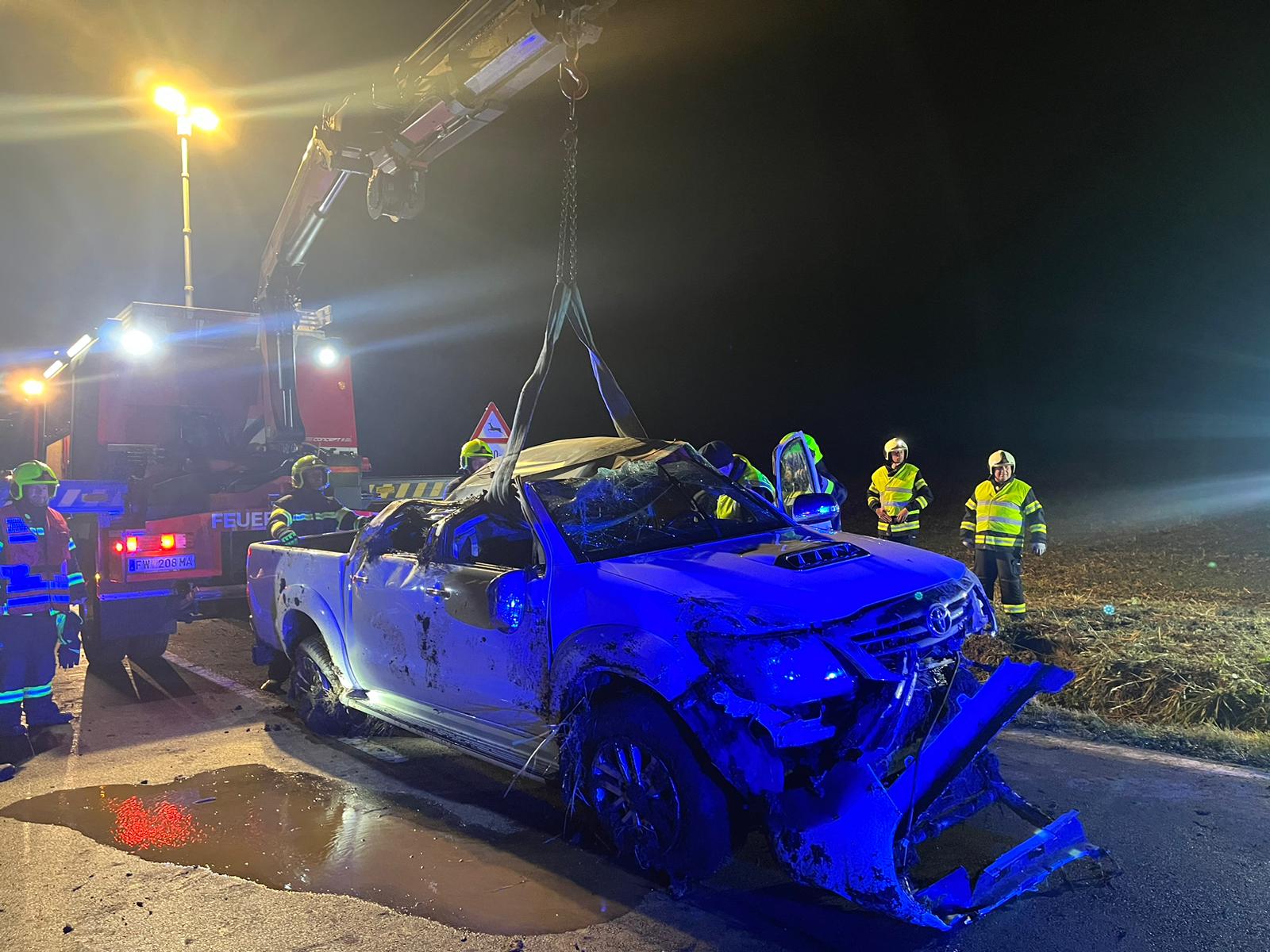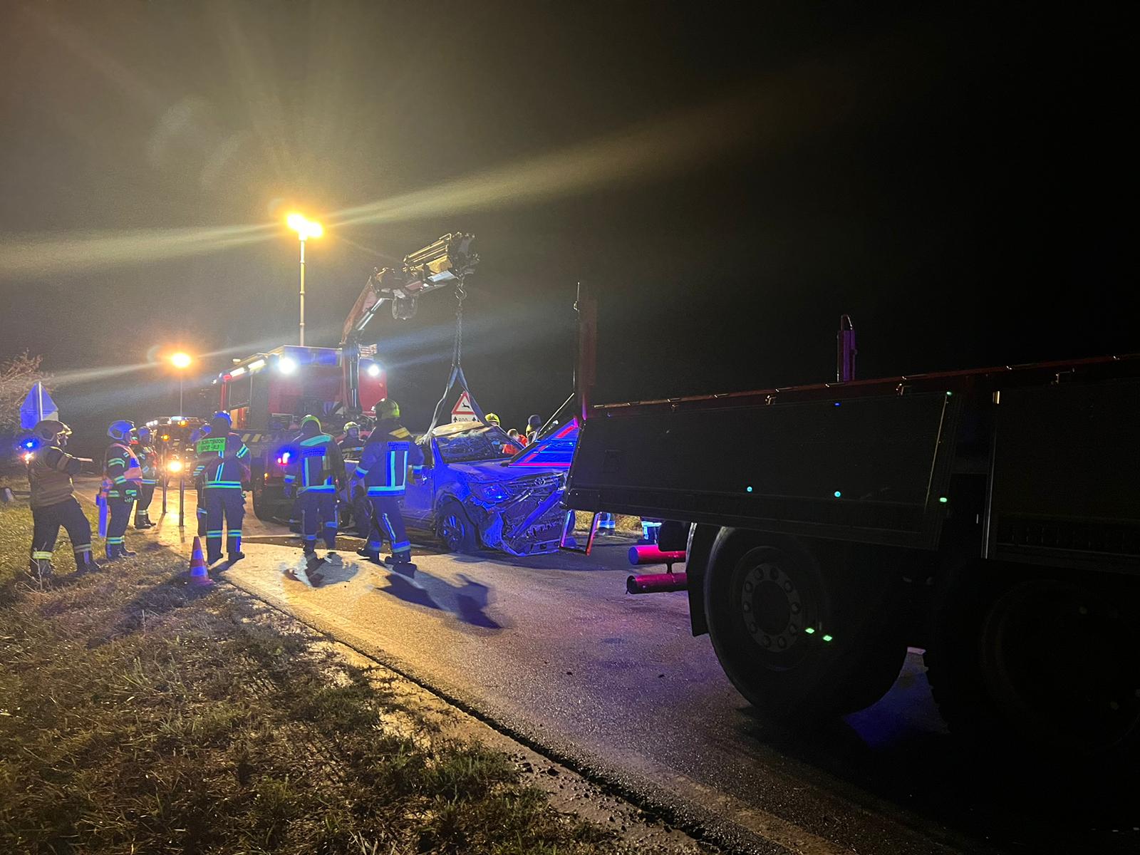 Ein PKW ist auf der L224 von der Fahrbahn abgekommen und fahruntüchtig im Straßengraben zum Liegen gekommen. Das Unfallfahrzeug wurde mit dem Kran auf das Wechselladerfahrzeug aufgeladen und anschließend auf einem gesicherten Parkplatz abgestellt.